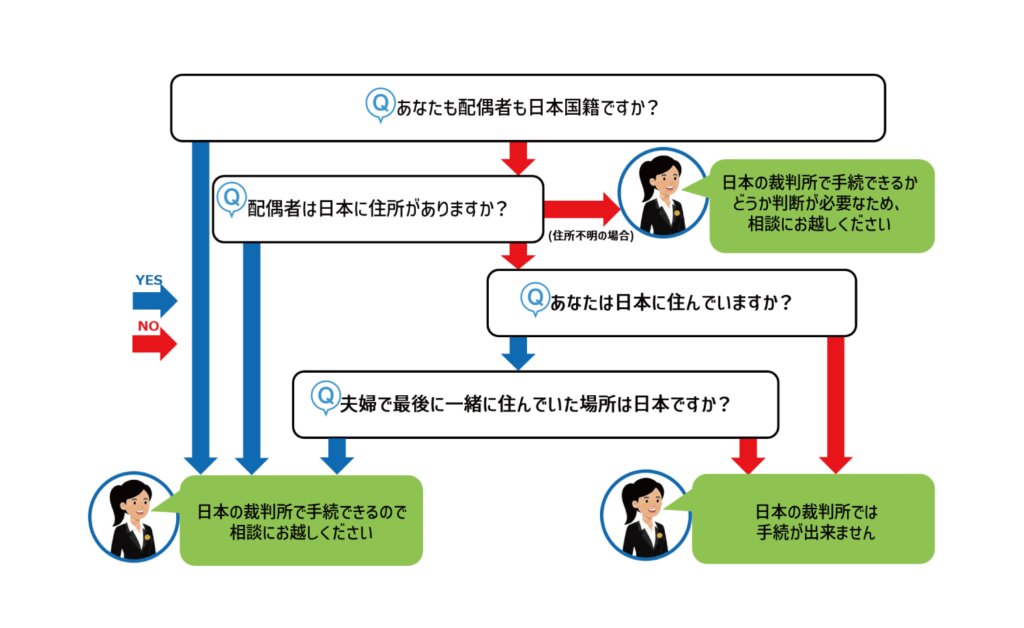 ご相談予約前に当事務所がお力になれるかを上のチャート図でご確認ください。「日本の裁判所では手続が出来ません」にたどり着いた方は、当事務所でご相談できる内容がご希望に添えない場合がございます。