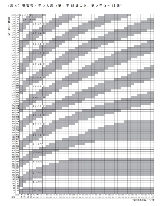この2本の線が交わる欄(マス)に書かれている金額の範囲が、養育費の目安となる標準的な月額です。