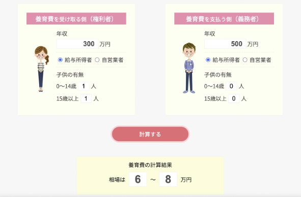 弁護士法人丸の内ソレイユ法律事務所では、簡単に養育費のシミュレーションができるページを公開しています。親の年収や子どもの人数や年齢区分など、条件を入力するだけで養育費の計算が可能です。