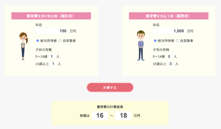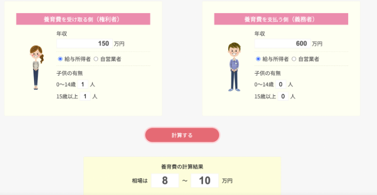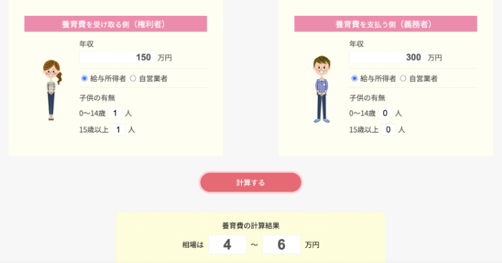 弁護士法人丸の内ソレイユ法律事務所が公開している、養育費シミュレーションを使用して試算してみました。条件は0〜14歳の子どもが1人、15歳以上の子どもが1人で、受け取る側の年収が300万円、支払う側の年収が400万円に設定します。結果として、4〜6万円という金額が提示されました。